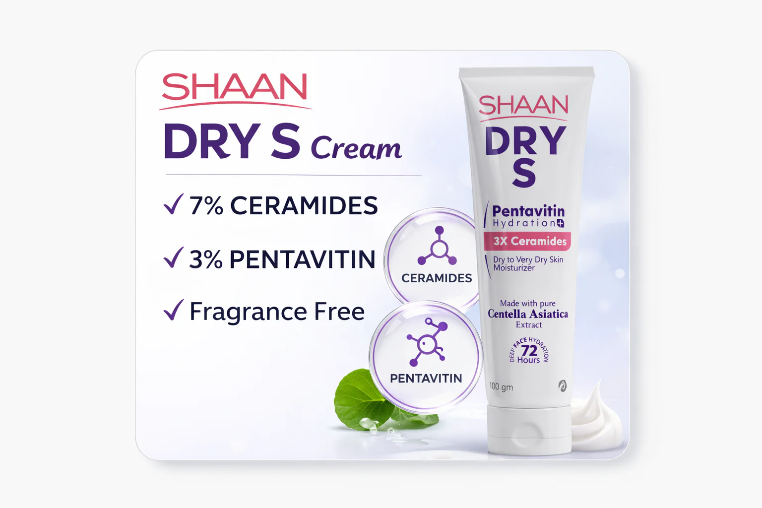 SHAAN DRY S Cream is a fragrance-free facial moisturizer formulated with a 16% high-performance active complex including 7% ceramides to restore the skin barrier, 5% deep hydration complex (Pentavitin and Hyaluronic Acid) to deliver long-lasting moisture, 3% dimethicone to reduce transepidermal water loss, and 1% Centella Asiatica to soothe irritation, making it ideal for dry, sensitive, and atopy-prone skin.